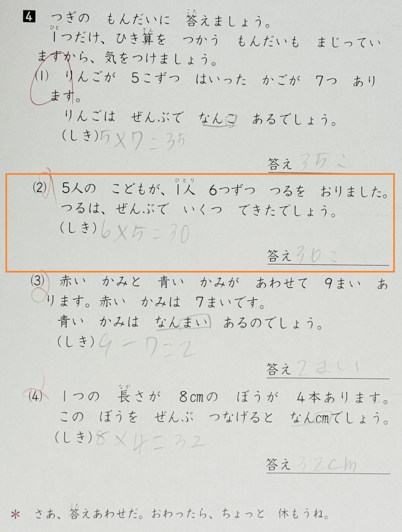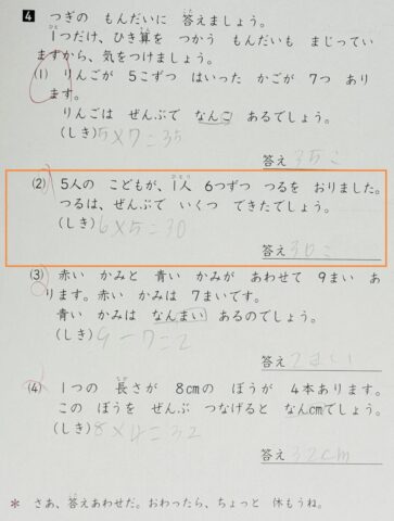 問題2) 5人の こどもが、1人 6つずつ つるを おりました。 つるは、ぜんぶで いくつ できたでしょう。